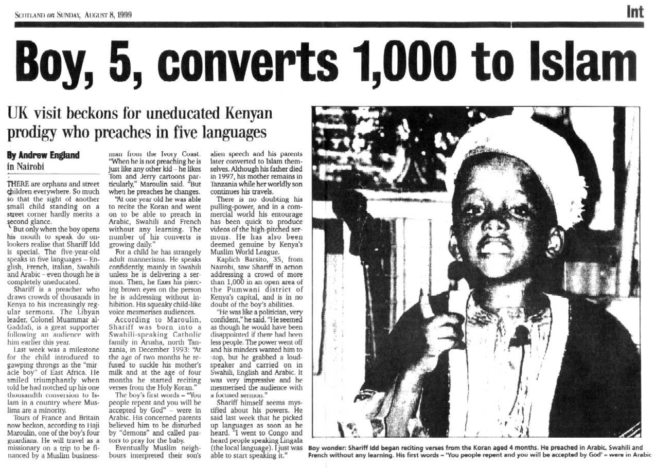 By the time he was one-year old, he was able to recite the whole Quran and went on to be able to preach in Arabic, Swahili and French without any formal education.